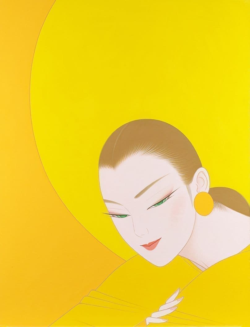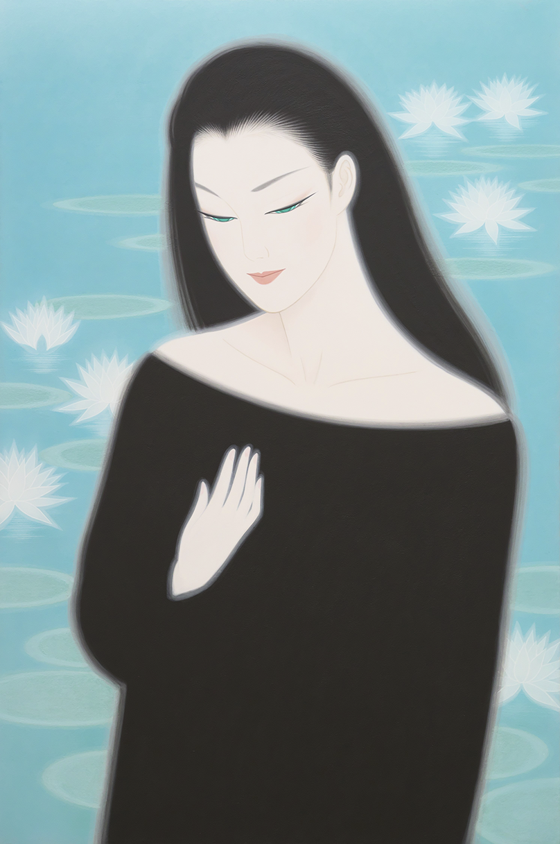 私が現在のような美人画を描くようになったのは、もともと女性を描くのが好きであったのと、もう一つは、その頃まで描いていた、スーパーリアルな西洋的表現の絵を私自身が描き続けていく事の意味を失いつつあったからだ。つまり、自分の中の感性や美意識が、日本的な物へ向き始めた事にあったと思っている。