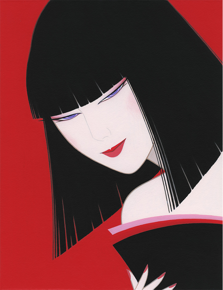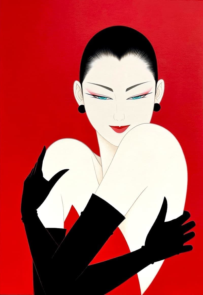 私が現在のような美人画を描くようになったのは、もともと女性を描くのが好きであったのと、もう一つは、その頃まで描いていた、スーパーリアルな西洋的表現の絵を私自身が描き続けていく事の意味を失いつつあったからだ。つまり、自分の中の感性や美意識が、日本的な物へ向き始めた事にあったと思っている。