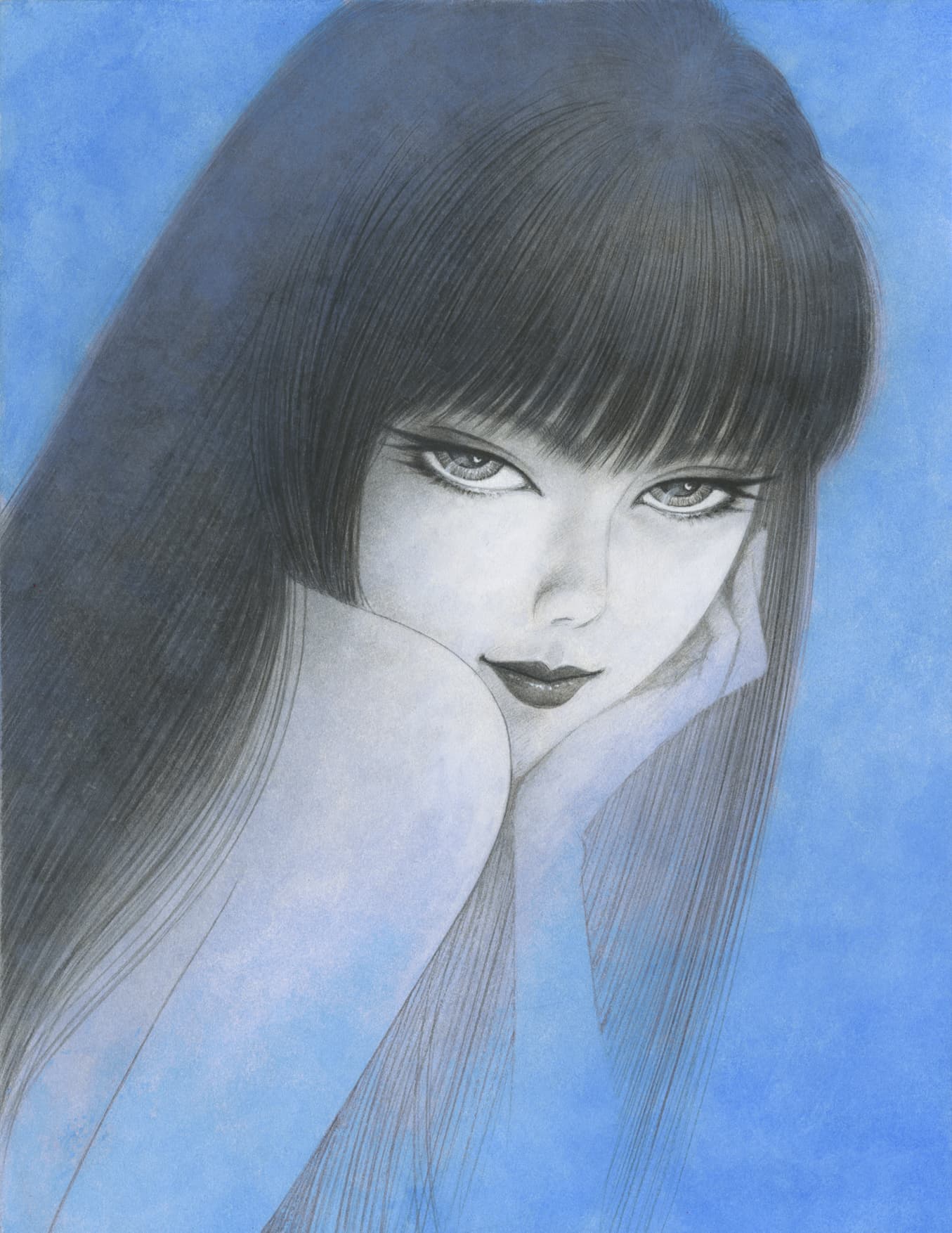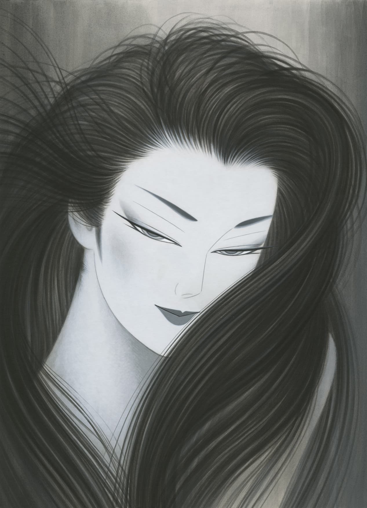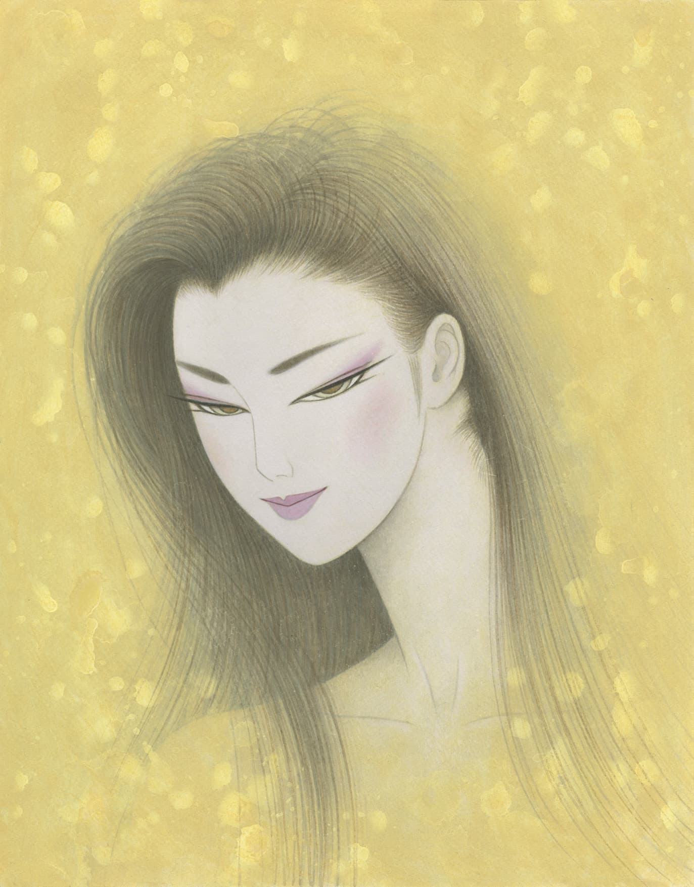 私が現在のような美人画を描くようになったのは、もともと女性を描くのが好きであったのと、もう一つは、その頃まで描いていた、スーパーリアルな西洋的表現の絵を私自身が描き続けていく事の意味を失いつつあったからだ。つまり、自分の中の感性や美意識が、日本的な物へ向き始めた事にあったと思っている。
