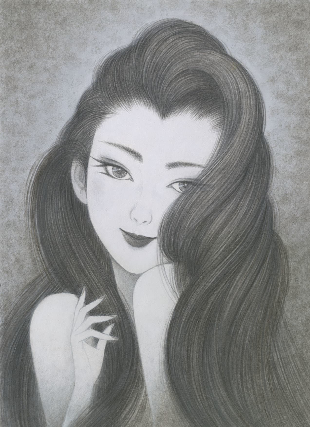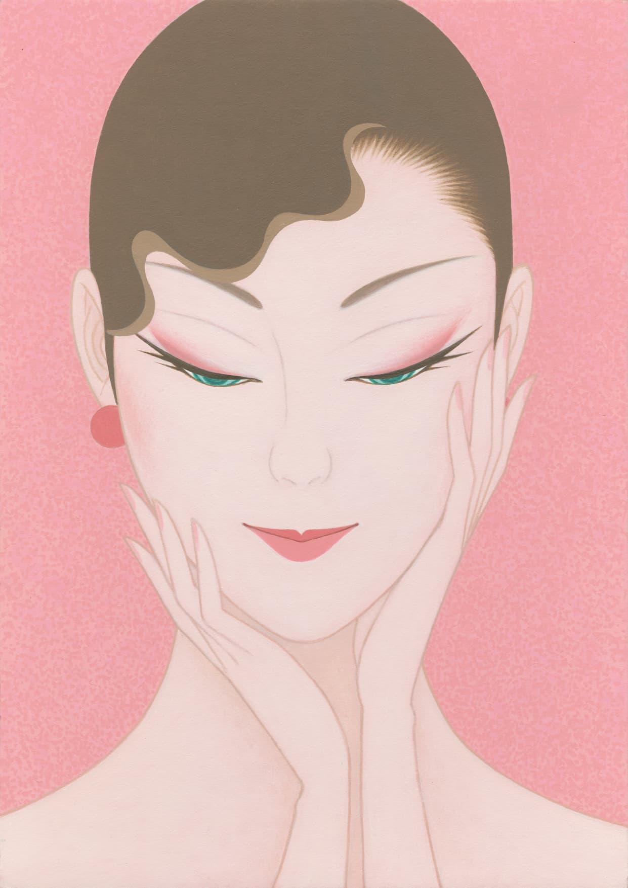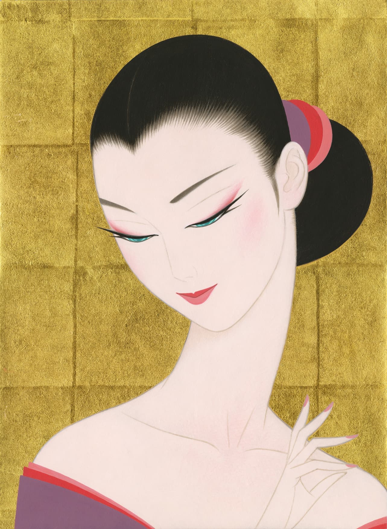 私が現在のような美人画を描くようになったのは、もともと女性を描くのが好きであったのと、もう一つは、その頃まで描いていた、スーパーリアルな西洋的表現の絵を私自身が描き続けていく事の意味を失いつつあったからだ。つまり、自分の中の感性や美意識が、日本的な物へ向き始めた事にあったと思っている。