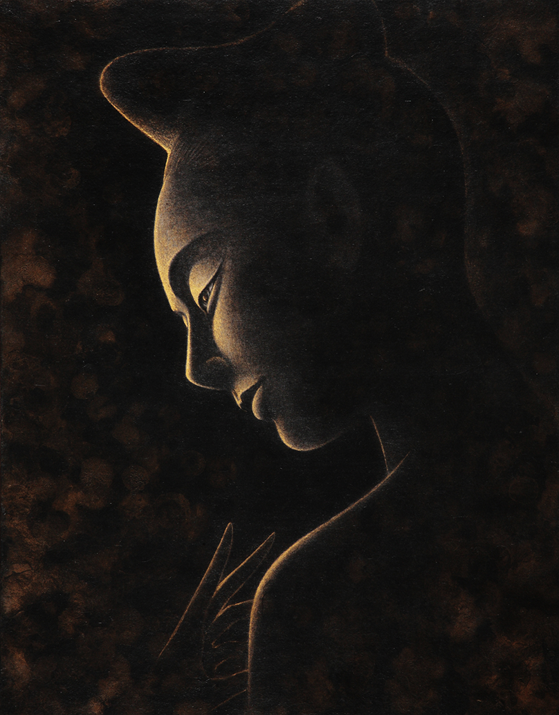 6作目となった「KANNON」は、すでに二度、展覧会にも出展したのだけれど、もっと美しくもっと慈悲深くと言う願望が抑え切れず、いつまでも筆を止める事ができなかった。いつか絵描きの思いと祈りが届けば良いのだが。