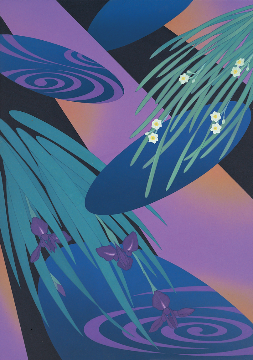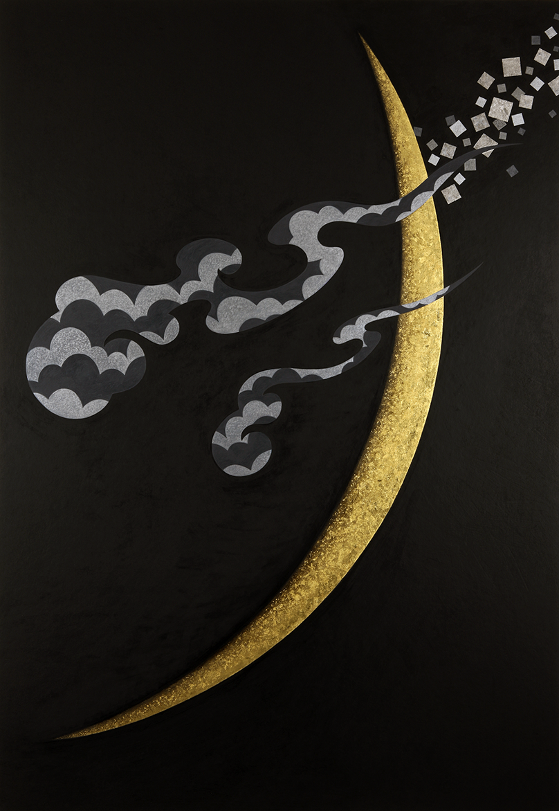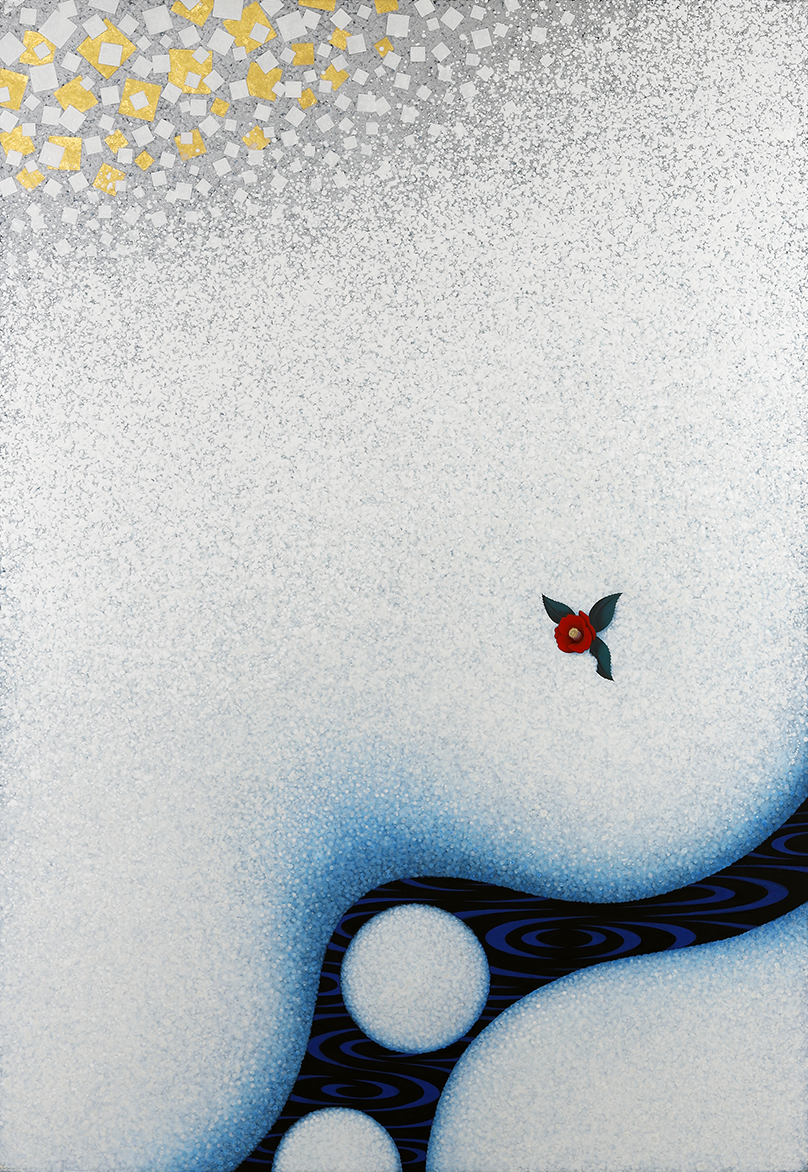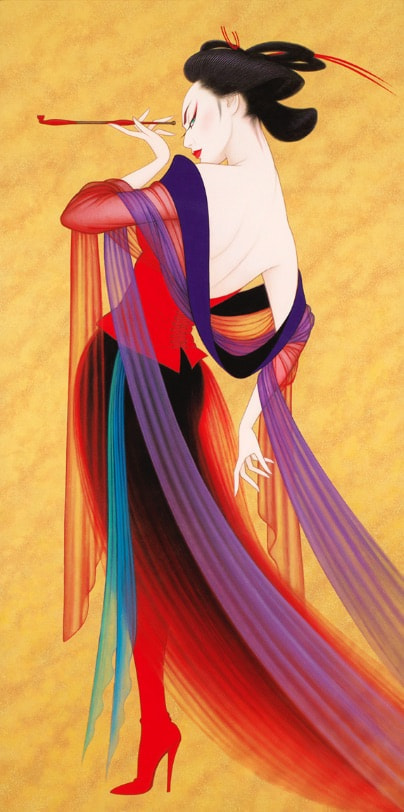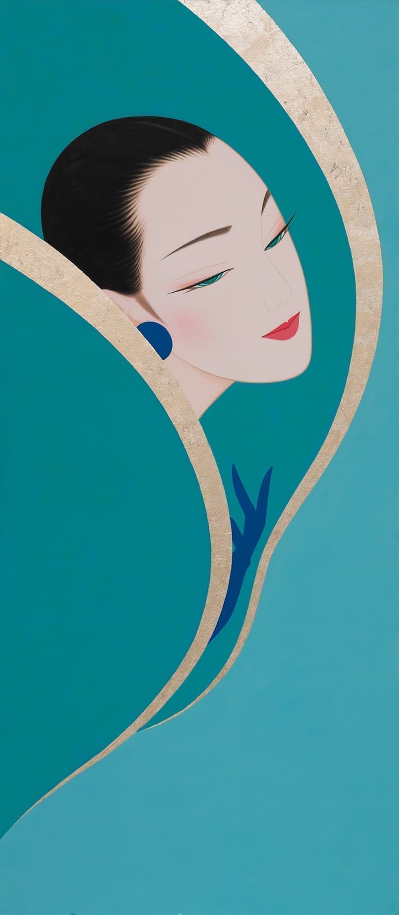 この作品「琳派シリーズ」は、私の美人画の原点にもなっている琳派を私なりのスタイルで描いてみた。多くの日本の美術からも影響を受けてはいるのだが、中でも琳派のデザイン性、装飾性、自由さにはより深い影響を受けている。もともと、琳派と呼ばれる絵師達には師弟、徒弟制度というものはなく、先人達へのリスペクトにより、引き継がれてきた様式だと言われている。